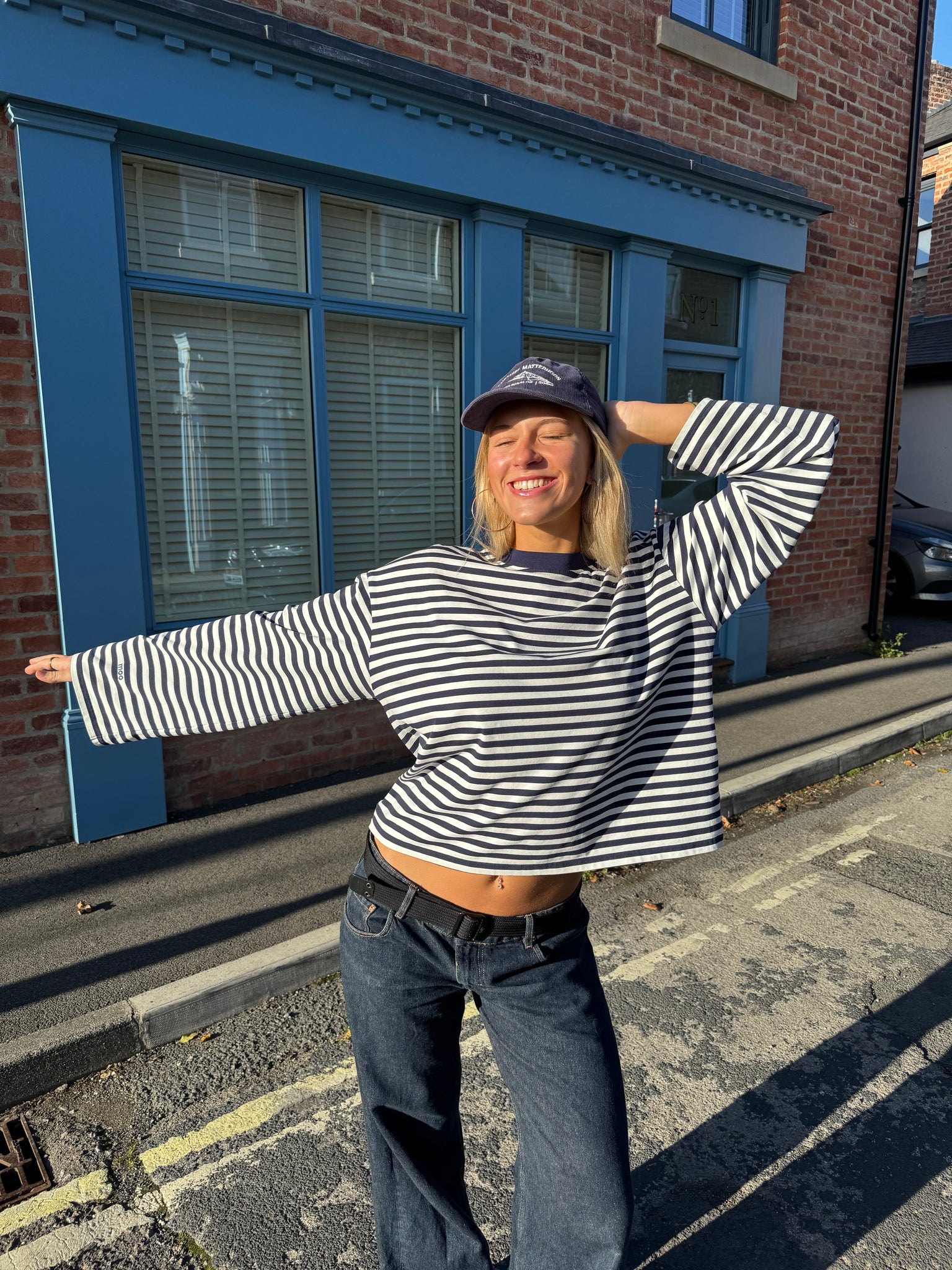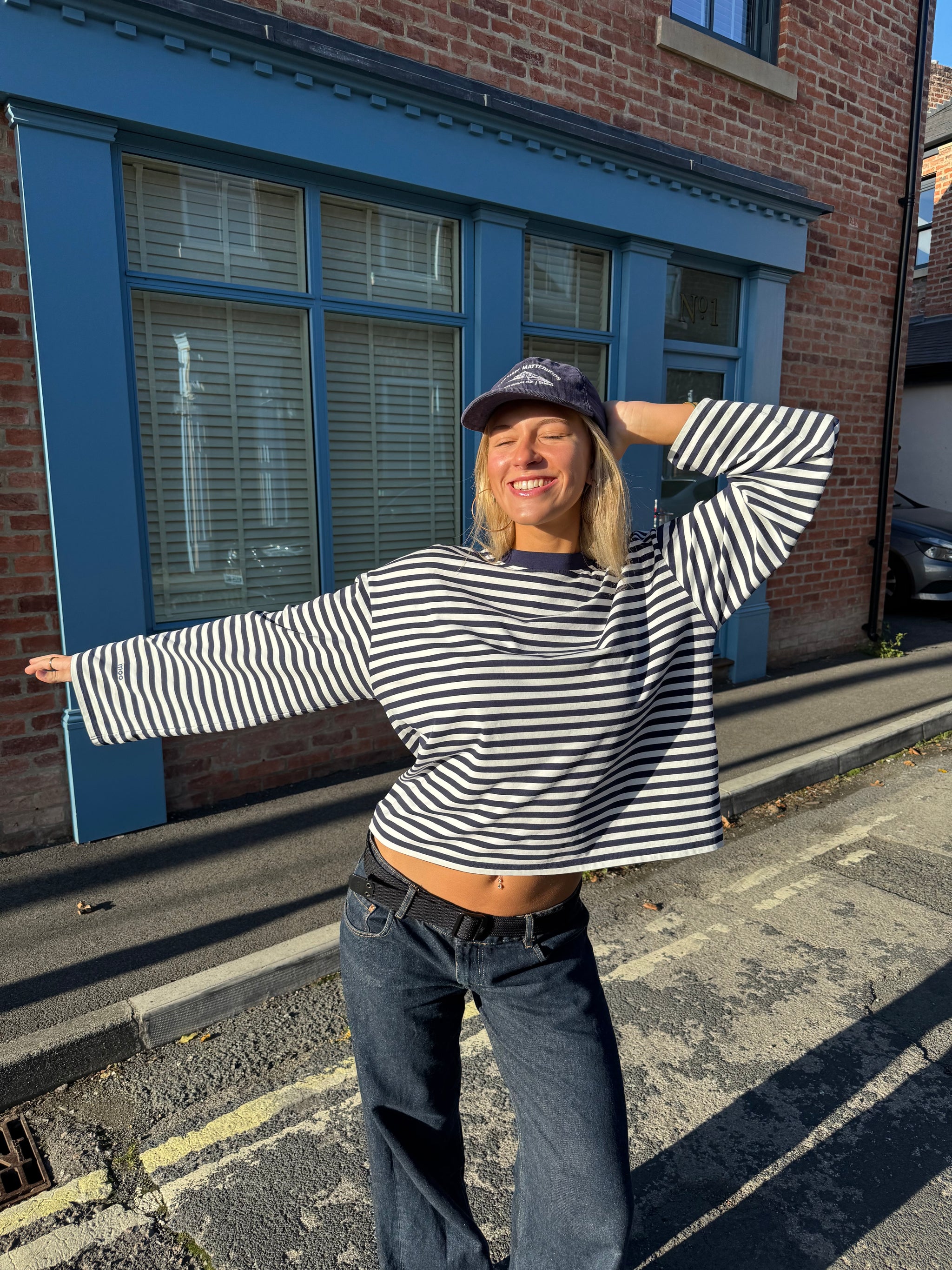 Our new organic cotton oversized long sleeve comes in a wide, boxy fit with wide sleeves that create that relaxed silhouette. The sleeve length is intentionally long, adding to the oversized look. You can choose your regular size to achieve the intended fit. The piece is finished with a moo embroidered detail on the sleeve.